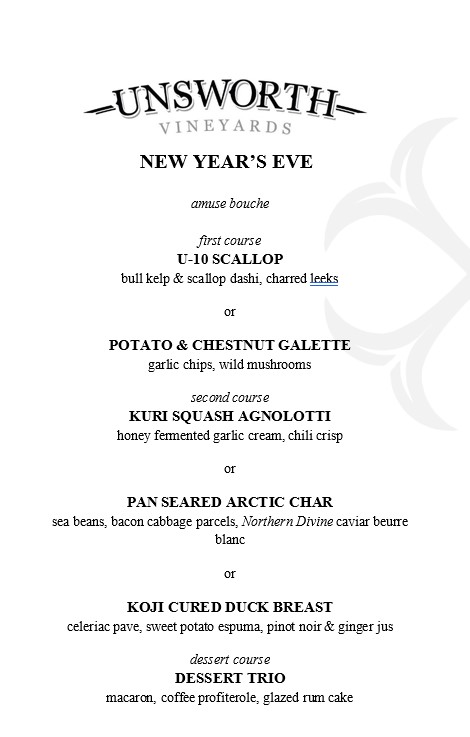 Come enjoy some round-the-table reflection on 2023, and the promise of the year ahead, with a 4-course New Year's Dinner on December 31st at The Restaurant at Unsworth Vineyards. Chef Dan Bain and team are excited to share this special, celebratory menu with you, and naturally, Sommelier Chris Turyk has curated the suggested wine pairings to make it even more of a culinary adventure!