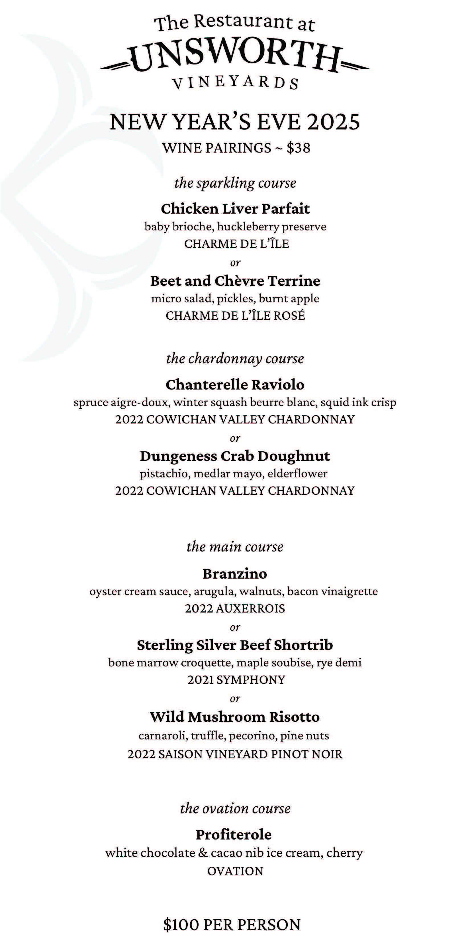 Celebrate the closing night of 2024 and toast to 2025 with The Restaurant at Unsworth Vineyards! Chef Dan Bain and his talented culinary team have fashioned up a delicious 4-course New Year's Dinner on December 31st. The dining room team led by Eli Wallace are excited to share this special, celebratory menu with you, and naturally, Sommelier Chris Turyk has curated the wine pairings to make it quintessentially Unsworth.