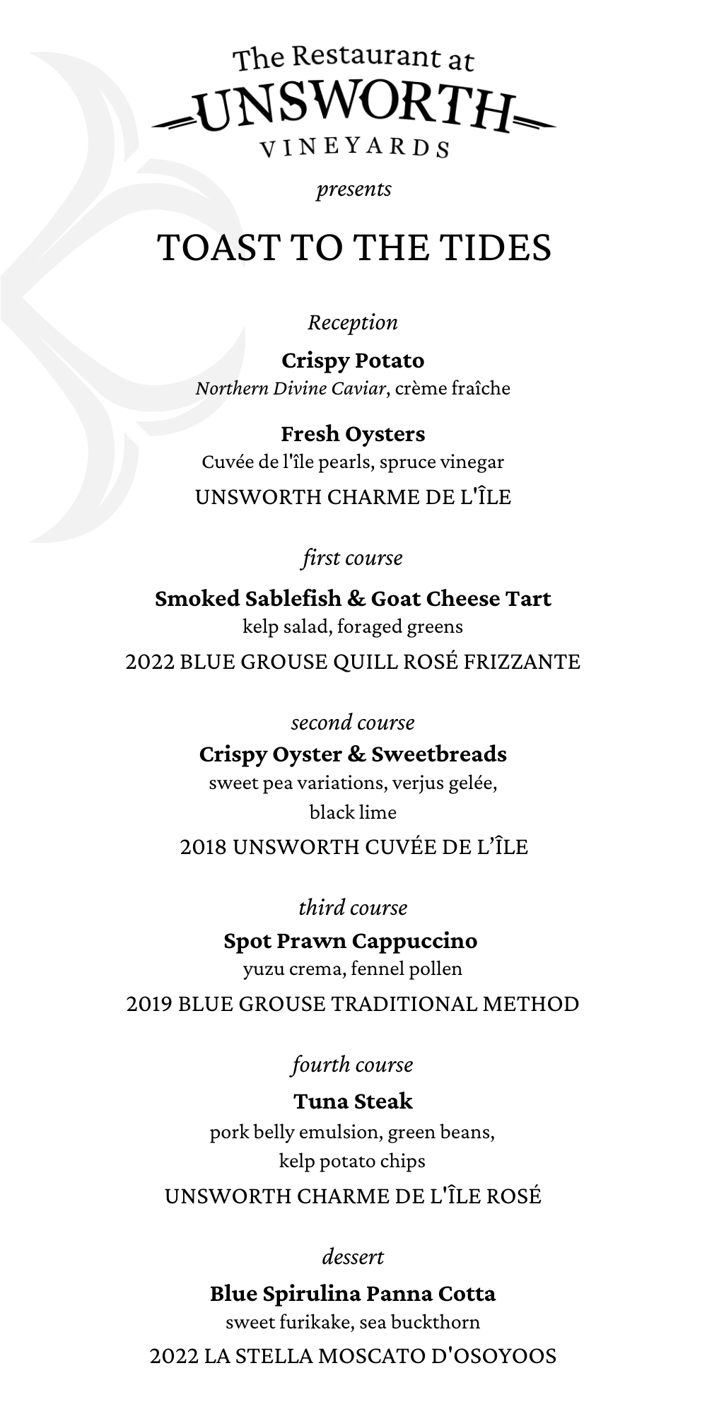 Join us on Thursday June 6th at The Restaurant at Unsworth Vineyards where Chef Dan Bain and team are hosting our Toast to the Tides dinner, a sparkling wine and seafood centric 5-course dinner, all paired to our sparkling wines!