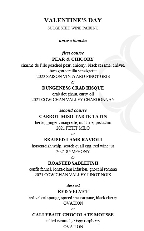 We have your Valentine's Day covered! Chef Dan Bain and team have created yet another fabulous prix fixe dinner to intrique the senses and spark some emotions. Naturally we have curated Unsworth wine pairings to match. The prix fixe menu starts at $90 with the addition of wine pairings for $35. Reservations are strongly encouraged.